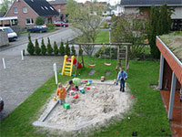 Zum Haus gehört eine große Liegewiese mit einem überdachten Grillplatz. Für die Kleinen gibt es einen Sandkasten und Schaukeln. Die Anliegerstraße